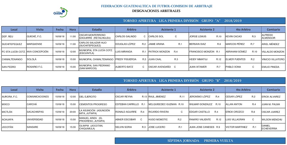 PRIMERA DIVISION / NOMBRAMIENTOS ARBITRALES SEPTIMA JORNADA TORNEO APERTURA 2018-2019