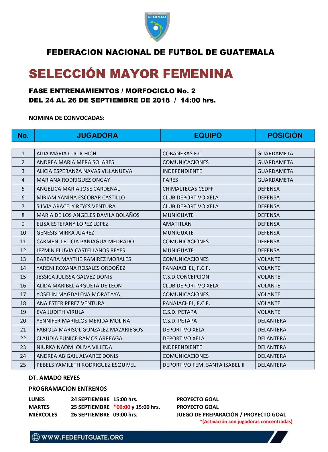 SELECCION MAYOR FEMENINA / MORFOCICLO NO. 2 / 24 AL 26 DE SEPTIEMBRE 2018