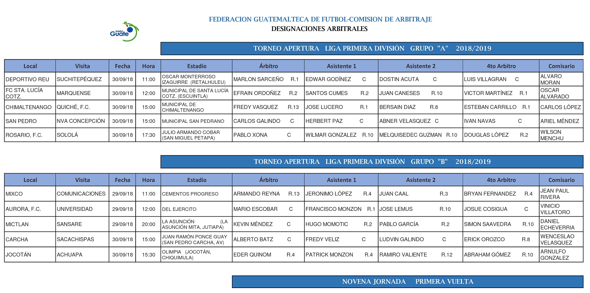 PRIMERA DIVISION / NOMBRAMIENTOS ARBITRALES NOVENA JORNADA TORNEO APERTURA 2018-2019