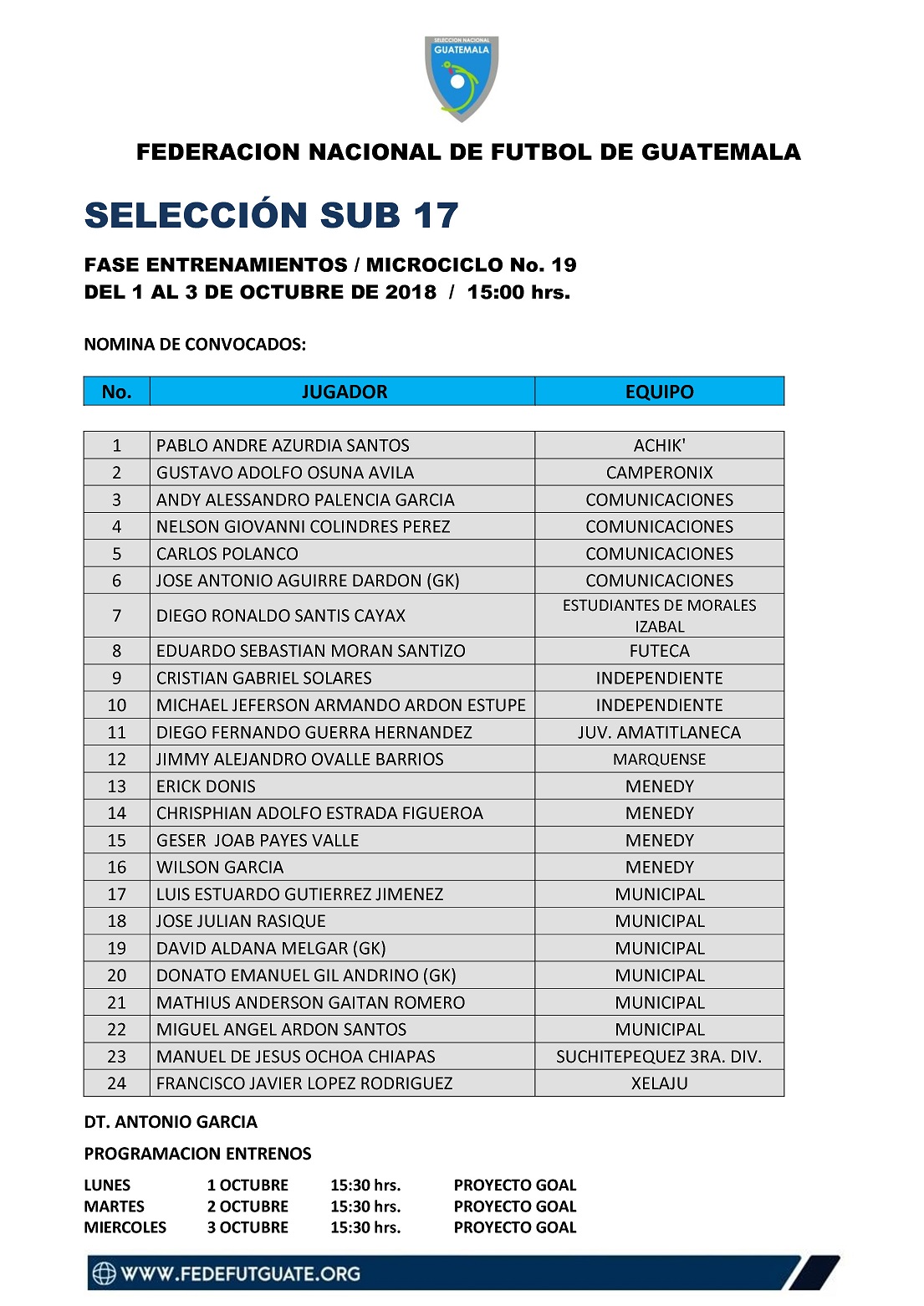 SELECCION SUB 17 / CONVOCATORIA MICROCICLO NO. 19 / 1 AL 3 DE OCTUBRE 2018