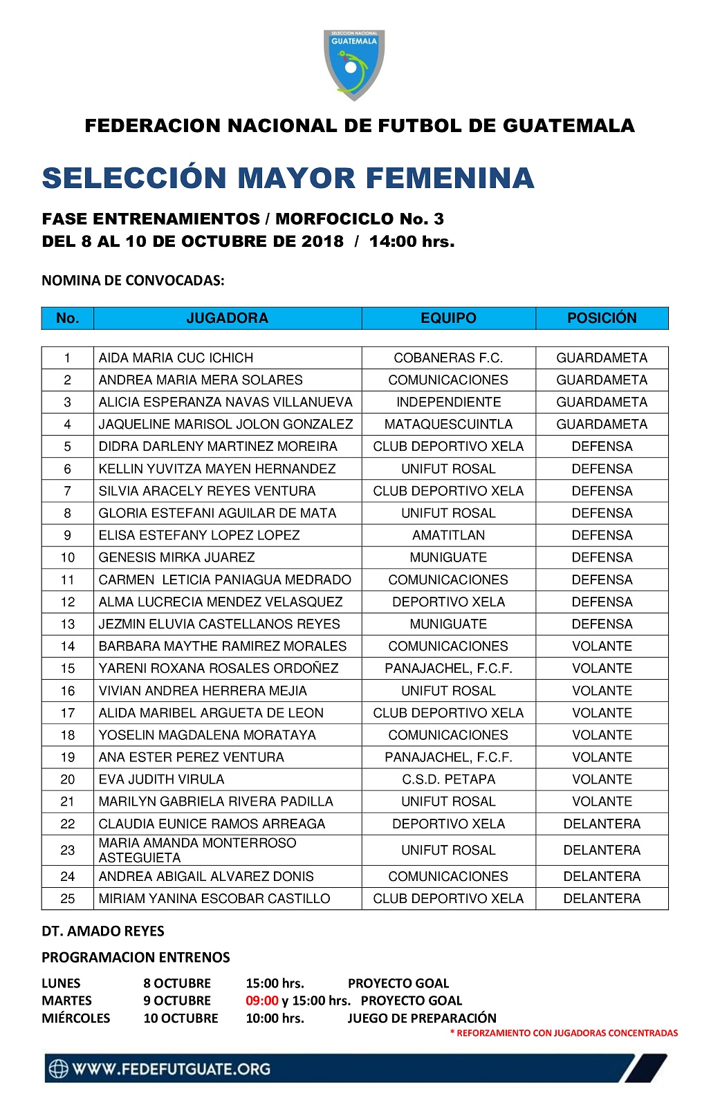 SELECCION MAYOR FEMENINA / MORFOCICLO NO. 3 / DEL 8 AL 10 DE OCTUBRE 2018