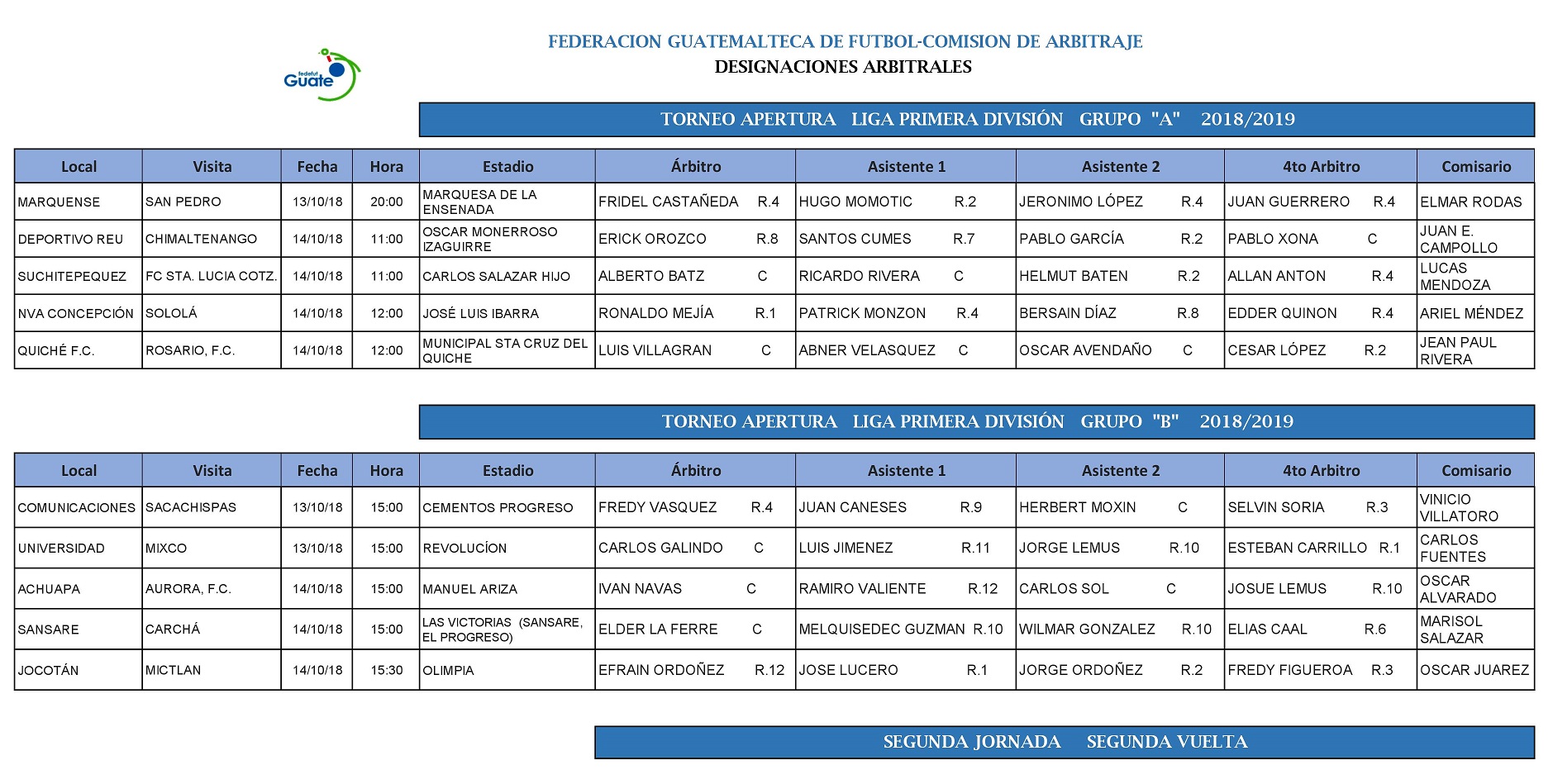PRIMERA DIVISION / NOMBRAMIENTOS ARBITRALES JORNADA No. 11 / TORNEO APERTURA 2018-2019