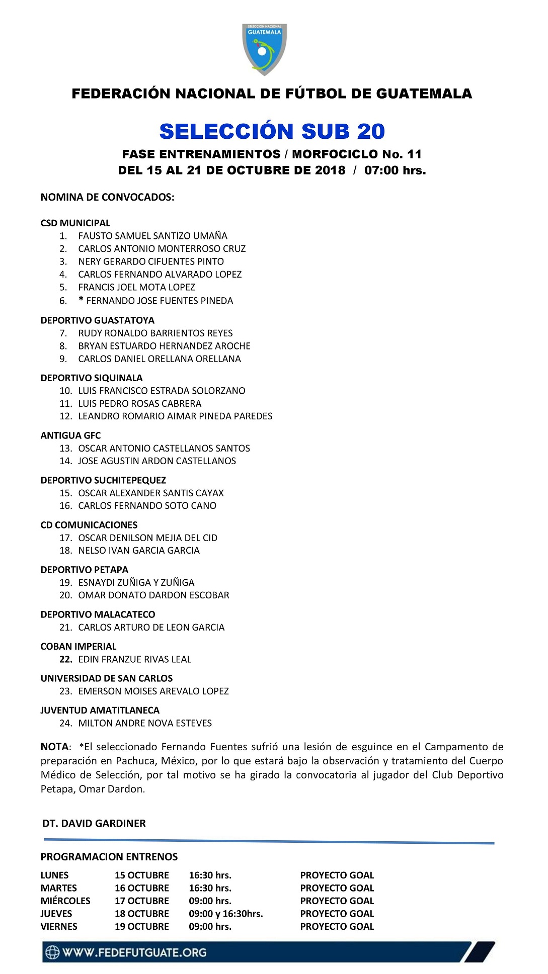 SELECCION SUB 20 / CONVOCATORIA MORFOCICLO No. 11 / DEL 15 AL 21 DE OCTUBRE 2018