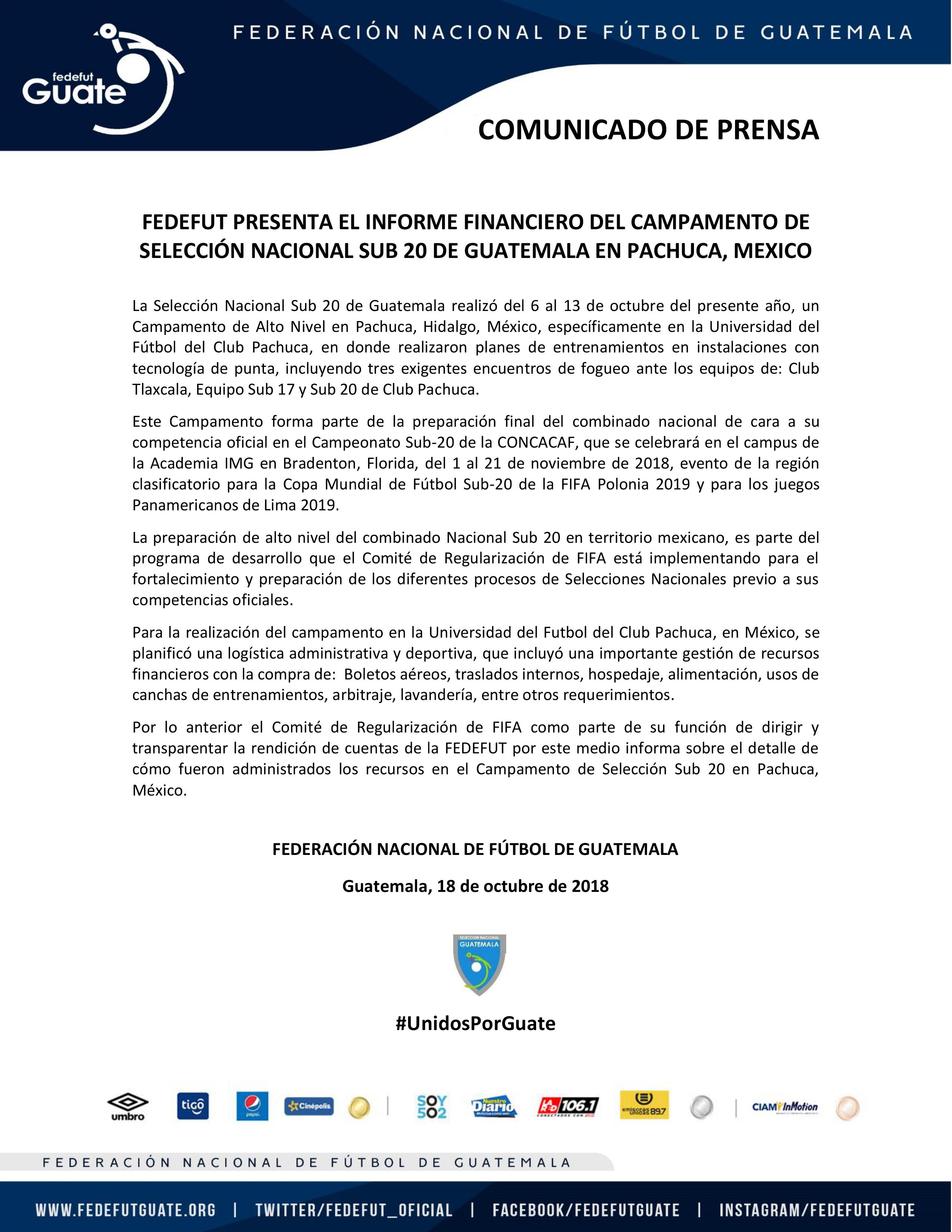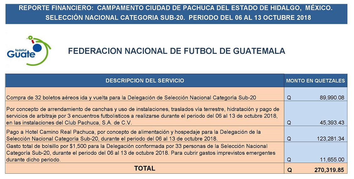 FEDEFUT PRESENTA EL INFORME FINANCIERO DEL CAMPAMENTO DE SELECCIÓN NACIONAL SUB 20 DE GUATEMALA EN PACHUCA, MEXICO