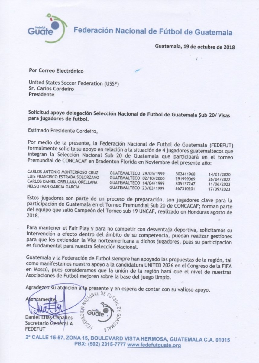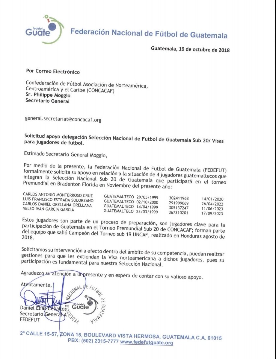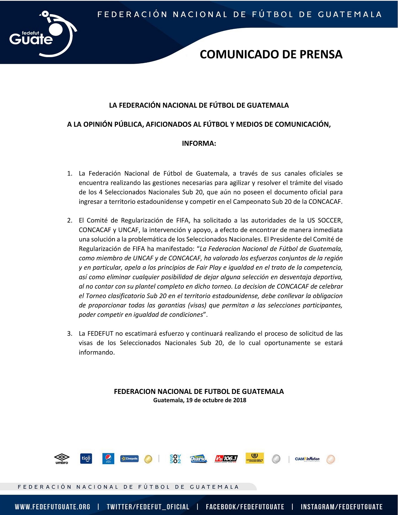 COMUNICADO DE PRENSA / FEDEFUT TRAMITE DE VISADO PARA SELECCIONADOS SUB 20 DE GUATEMALA