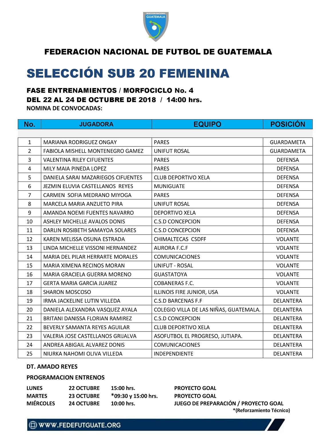 SELECCION SUB 20 FEMENINA / CONVOCATORIA MORFOCICLO No. 4 / DEL 22 AL 24 DE OCTUBRE 2018