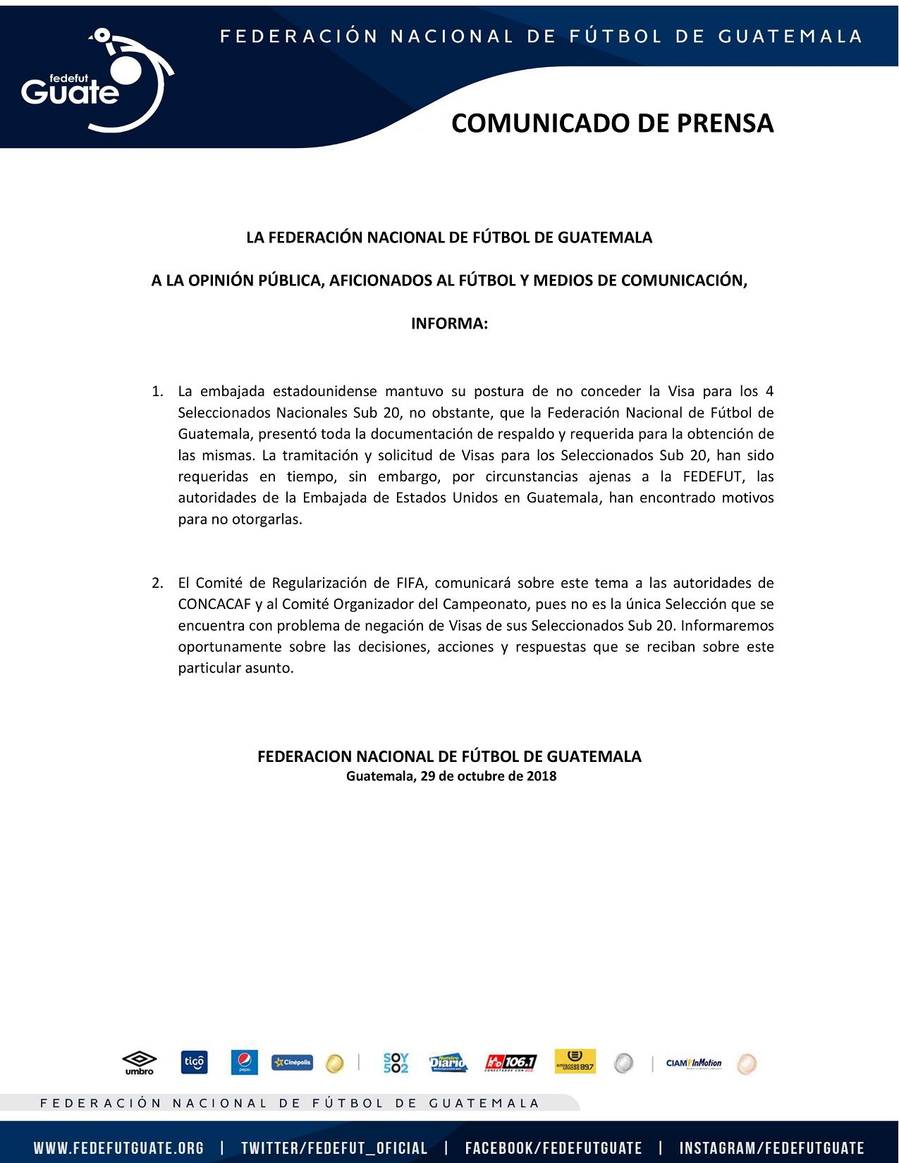 COMUNICADO DE PRENSA / PROCESO DE VISAS PARA SELECCIONADOS SUB 20 DE GUATEMALA