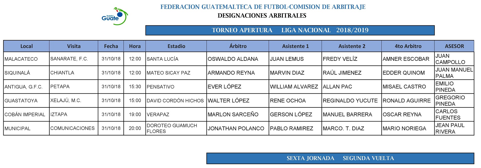 LIGA NACIONAL / NOMBRAMIENTOS ARBITRALES / JORNADA No. 17 / TORNEO APERTURA 2018/2019