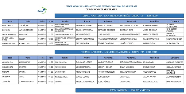 PRIMERA DIVISION / NOMBRAMIENTOS ARBITRALES JORNADA No. 15 / TORNEO APERTURA 2018-2019