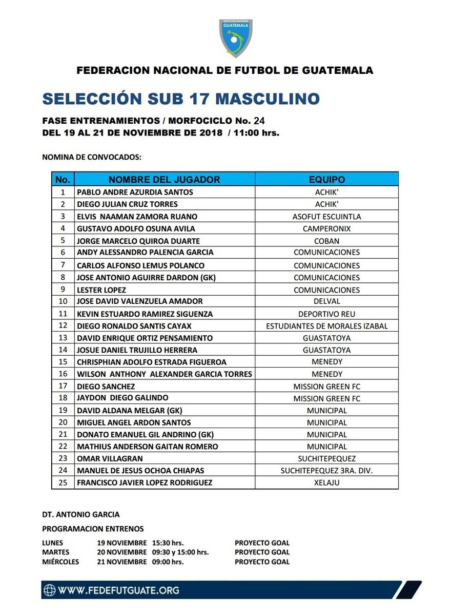 SELECCION SUB 17 / CONVOCATORIA MICROCICLO NO. 24 / DEL 19 AL 21 DE NOVIEMBRE 2018