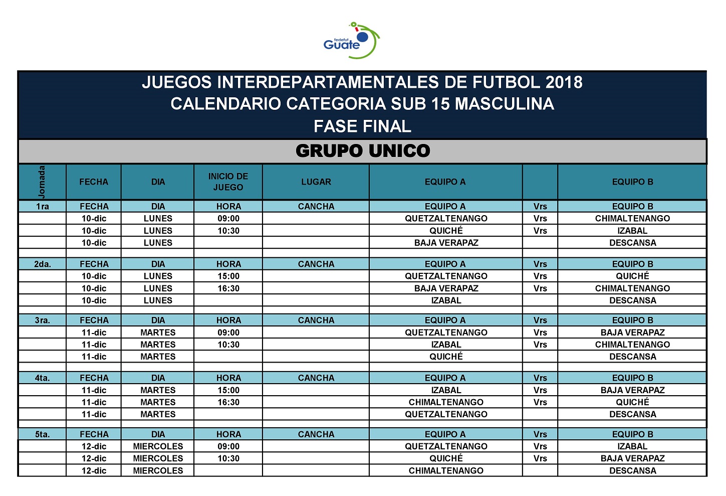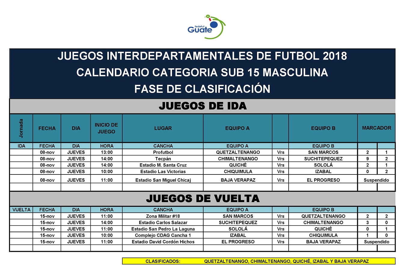 CALENDARIO CATEGORIA SUB 15 MASCULINA / JUEGOS INTERDEPARTAMENTALES DE FUTBOL 2018