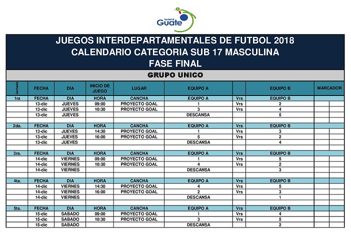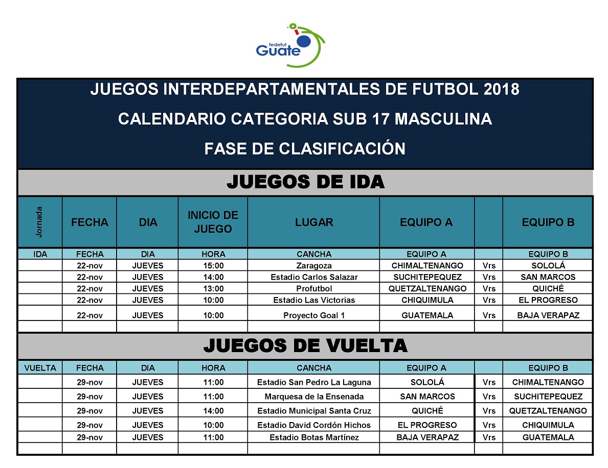 CALENDARIO CATEGORIA SUB 17 MASCULINA / JUEGOS INTERDEPARTAMENTALES DE FUTBOL 2018