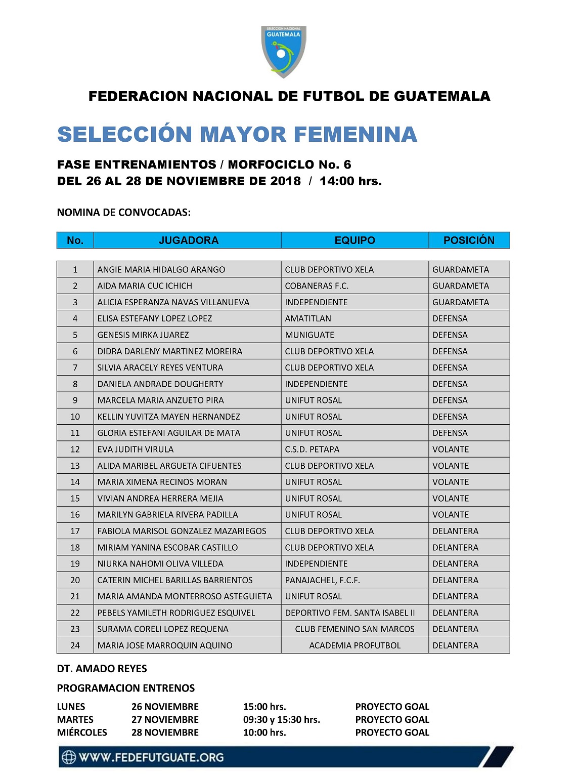 SELECCION MAYOR FEMENINA / MORFOCICLO NO. 6 / DEL 26 AL 28 DE NOVIEMBRE 2018