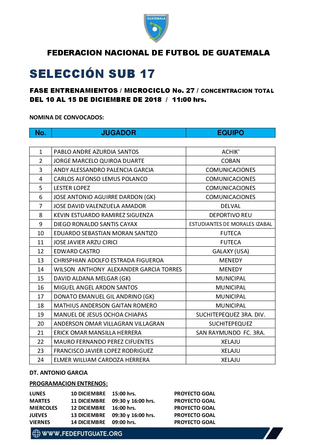 SELECCION SUB 17 / CONVOCATORIA MICROCICLO NO. 27 / DEL 10 AL 15 DE DICIEMBRE 2018