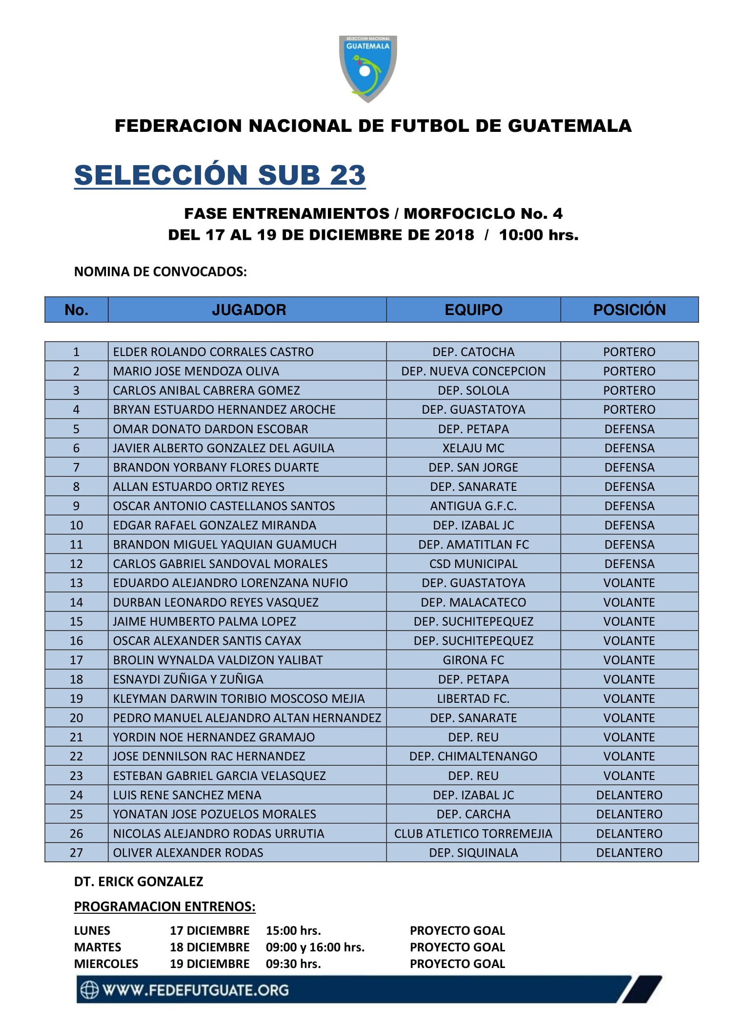 SELECCION SUB 23 / CONVOCATORIA MORFOCICLO NO. 4 / DEL 17 AL 19 DE DICIEMBRE 2018