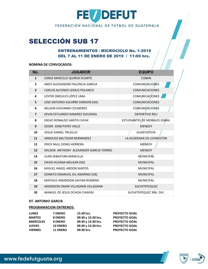 SELECCION SUB 17 / CONVOCATORIA MICROCICLO NO. 1-2019 / DEL 7 AL 11 DE ENERO 2019
