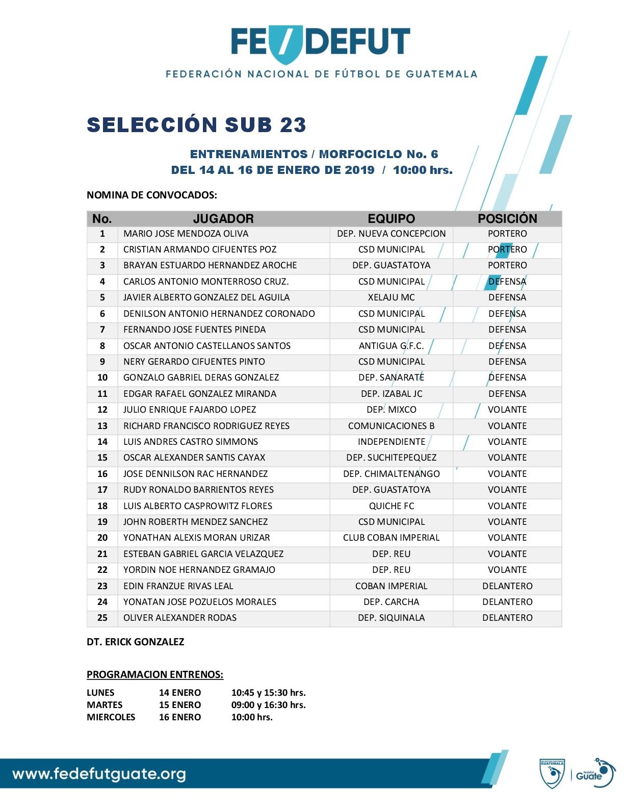 SELECCION SUB 23 / CONVOCATORIA MORFOCICLO NO. 6 / DEL 14 AL 16 DE ENERO 2019