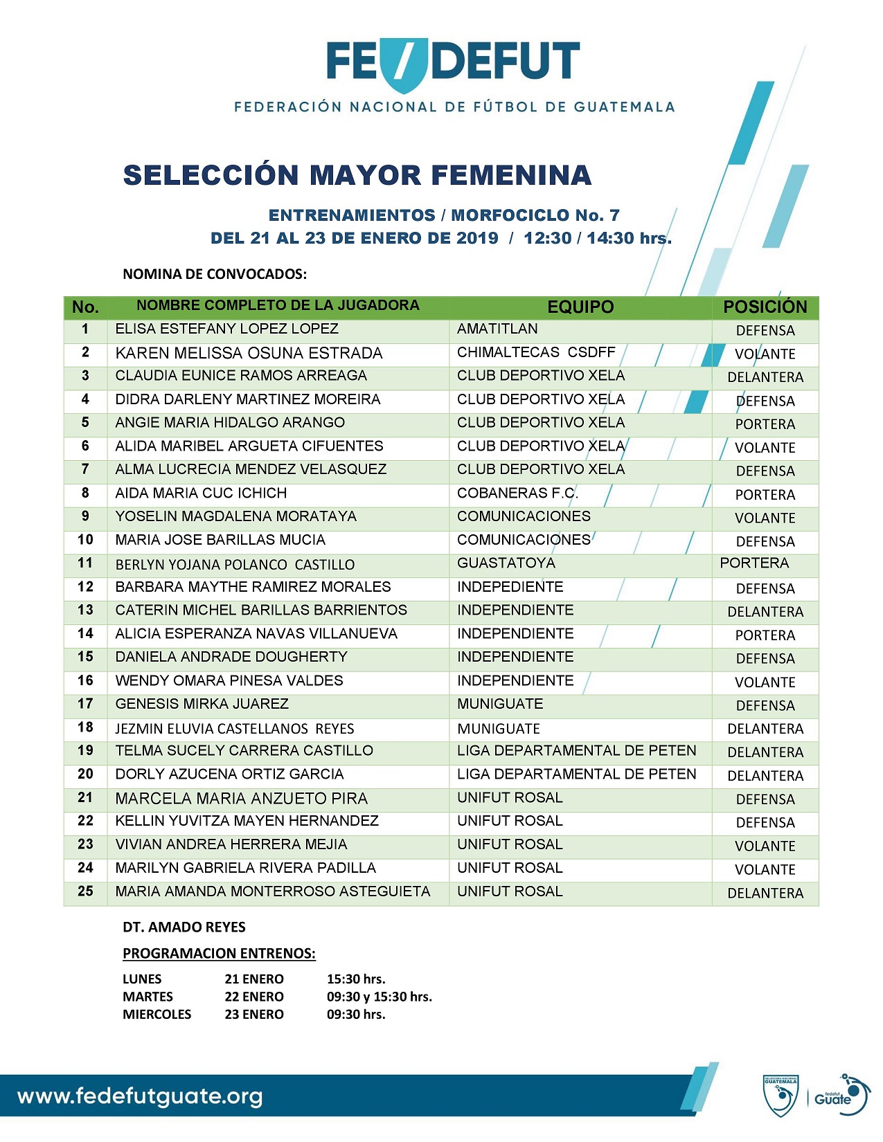 SELECCION MAYOR FEMENINA / CONVOCATORIA MORFOCICLO No. 7 / DEL 21 AL 23 DE ENERO DE 2019