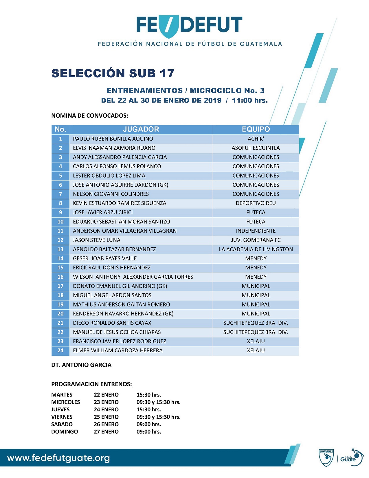 SELECCION SUB 17 / CONVOCATORIA MICROCICLO NO. 3-2019 / DEL 22 AL 30 DE ENERO 2019