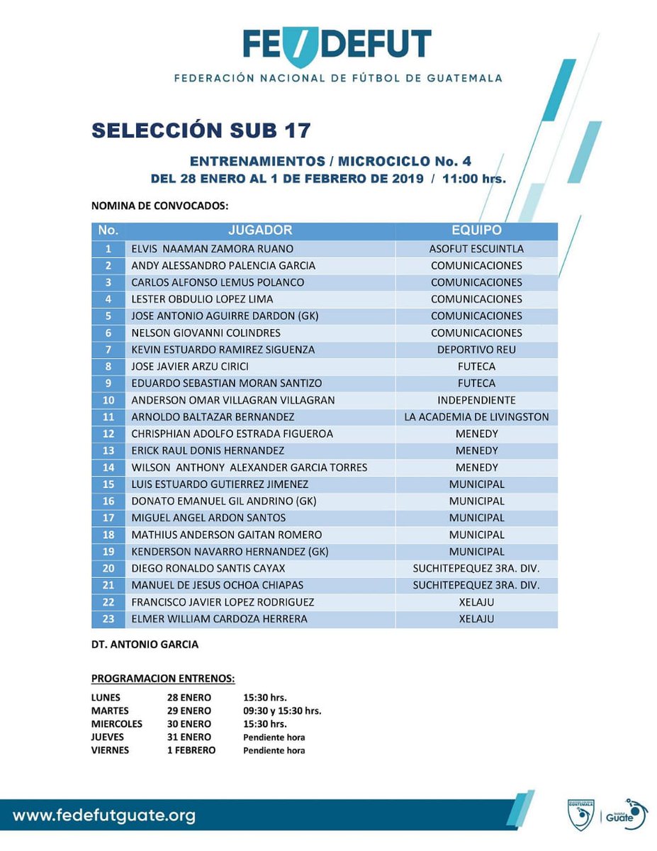 SELECCION SUB 17 / CONVOCATORIA MICROCICLO NO. 4-2019 / DEL 28 ENERO AL 1 DE FEBRERO 2019