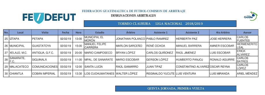 LIGA NACIONAL / NOMBRAMIENTOS ARBITRALES / QUINTA JORNADA TORNEO CLAUSURA 2019