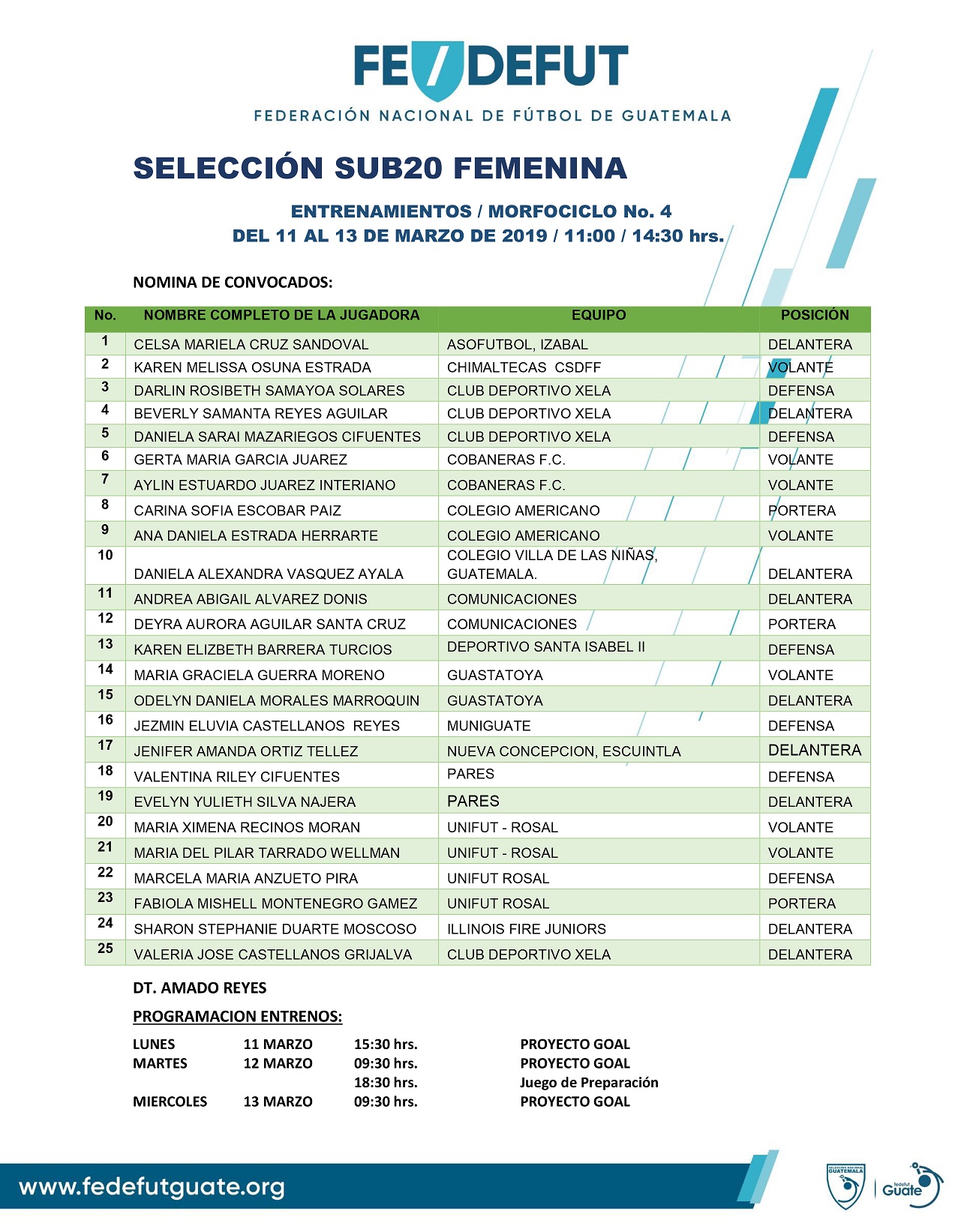 SELECCION SUB 20 FEMENINA / CONVOCATORIA MORFOCICLO No. 4 / DEL 11 AL 13 DE MARZO 2019