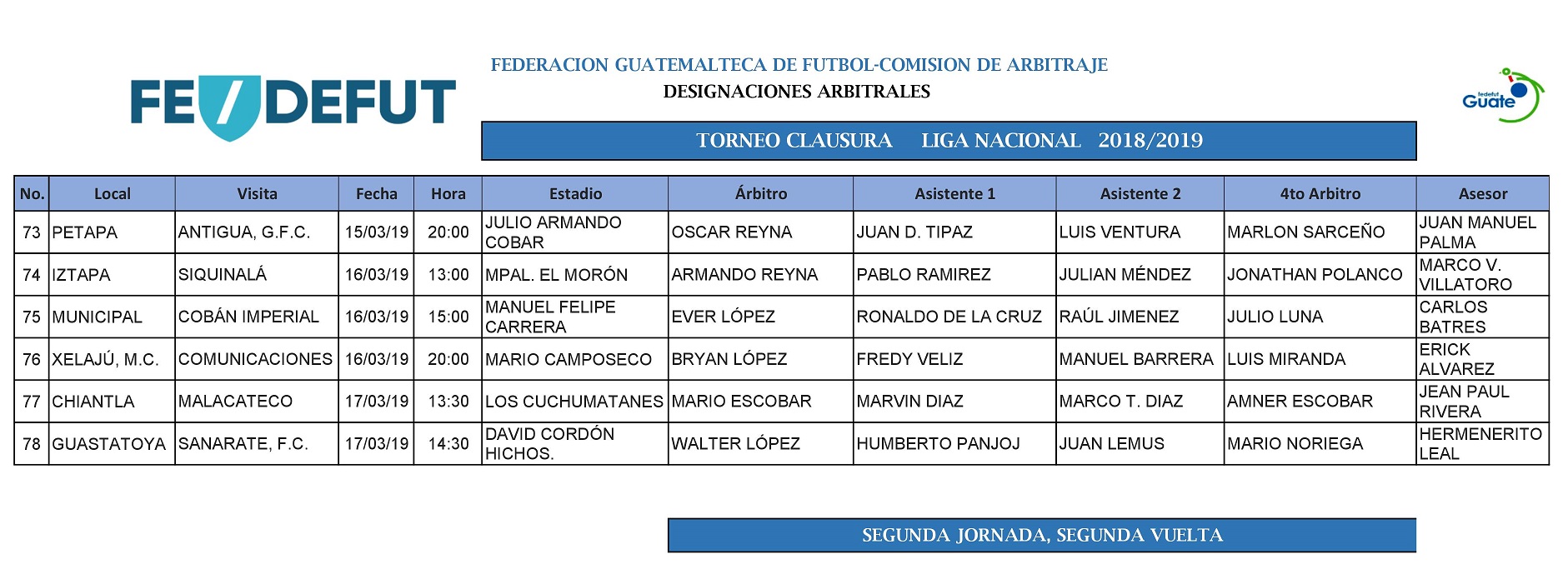 LIGA NACIONAL / NOMBRAMIENTOS ARBITRALES / JORNADA No. 13 DEL TORNEO CLAUSURA 2019