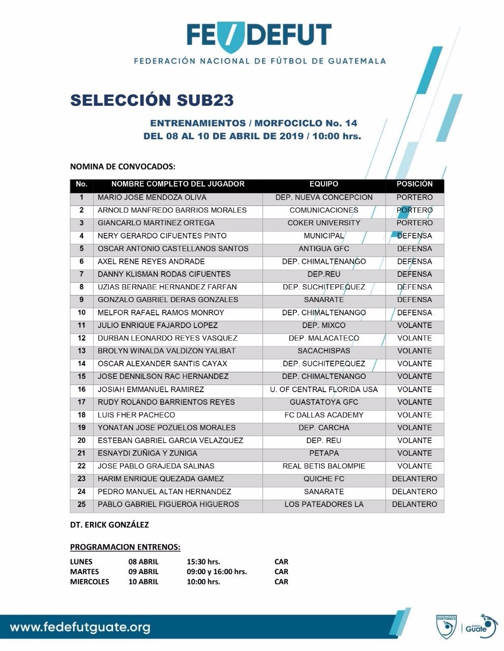 SELECCION SUB 23 / CONVOCATORIA MORFOCICLO NO.14 / DEL 8 AL 10 DE ABRIL 2019