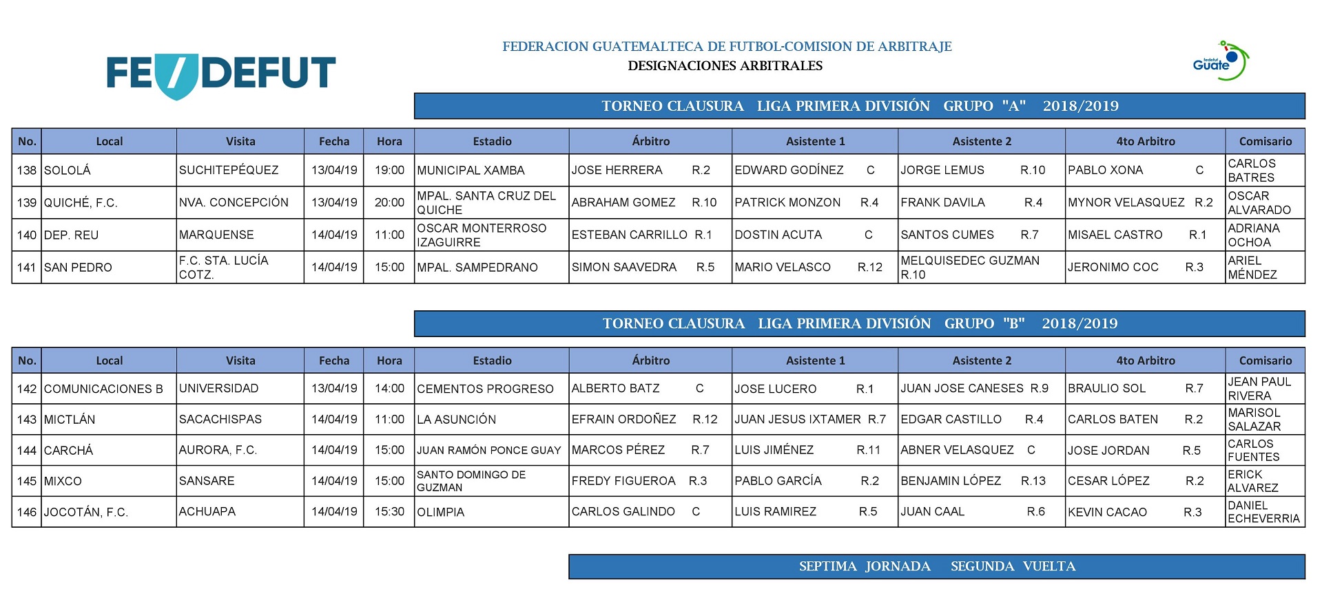LIGA PRIMERA DIVISION / NOMBRAMIENTOS ARBITRALES JORNADA 13 y 14 DE ABRIL 2019