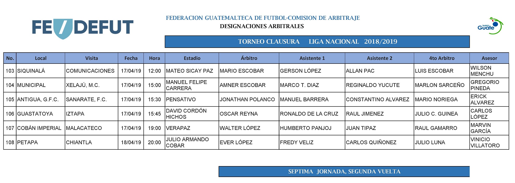 LIGA NACIONAL / NOMBRAMIENTOS ARBITRALES DEL 17 y 18 DE ABRIL DE 2019