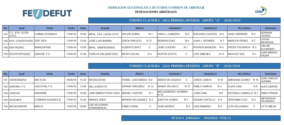 PRIMERA DIVISION / NOMBRAMIENTOS ARBITRALES DEL 16 y 17 DE ABRIL DE 2019