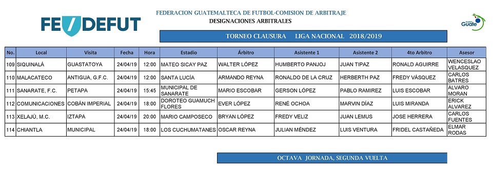 LIGA NACIONAL / NOMBRAMIENTOS ARBITRALES DEL 24 DE ABRIL DE 2019