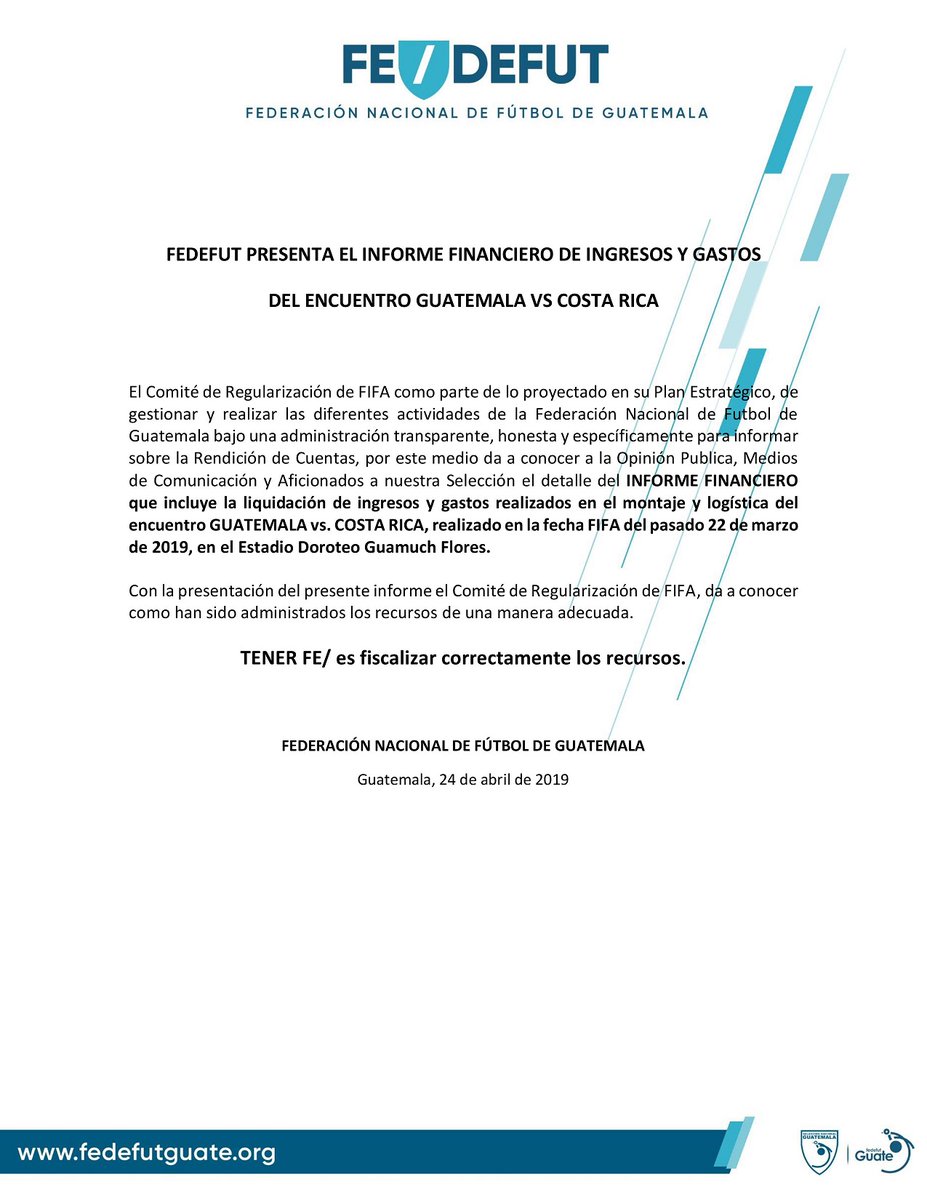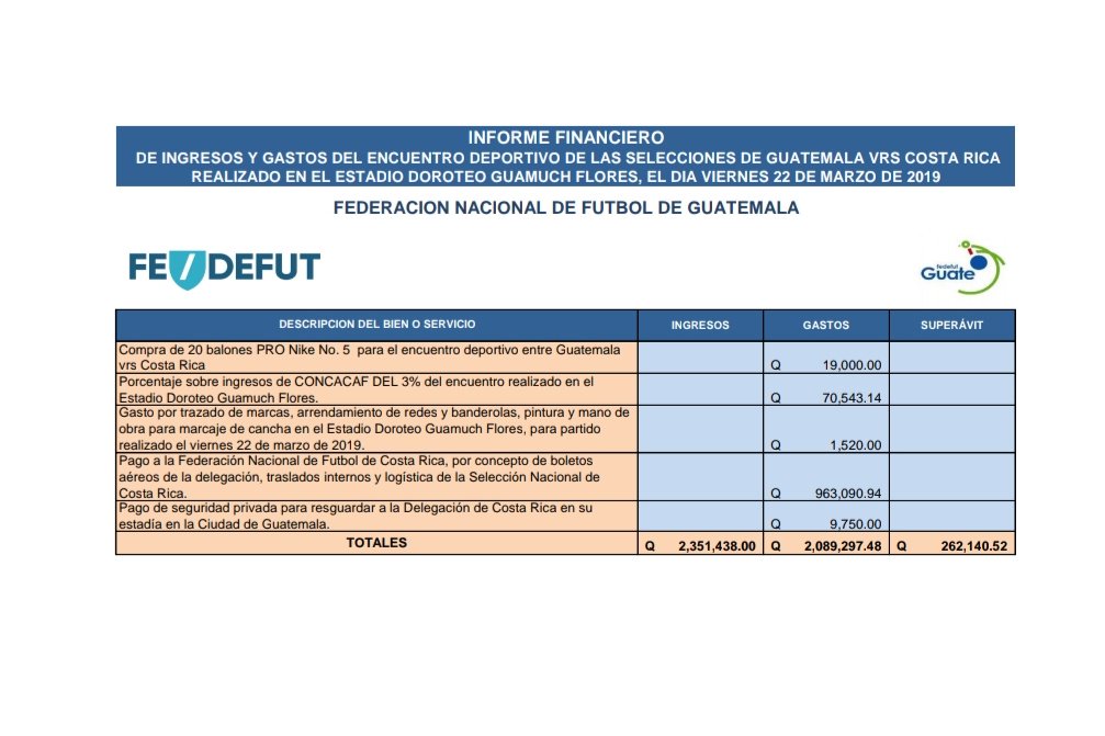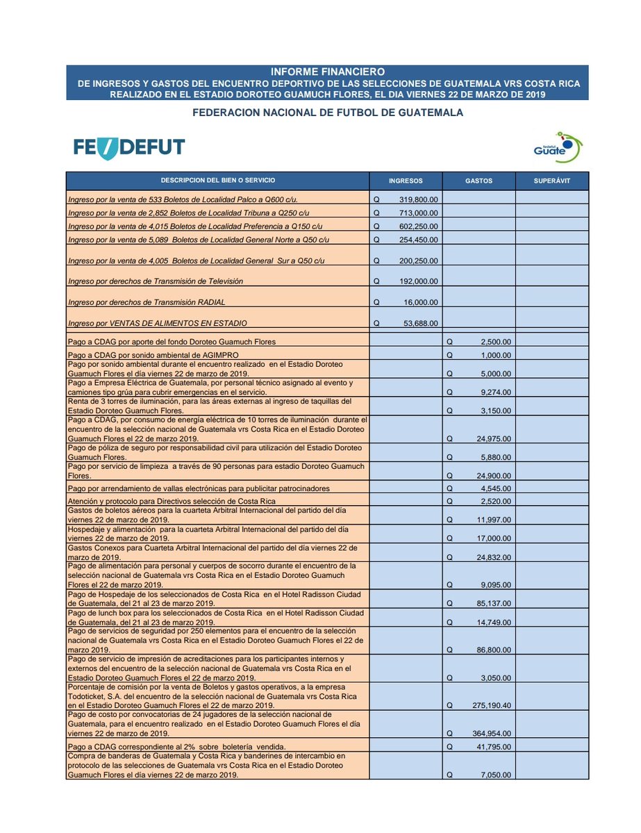 FEDEFUT PRESENTA EL INFORME FINANCIERO DE INGRESOS Y GASTOS ENCUENTRO GUATEMALA vs. COSTA RICA