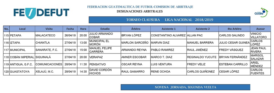 LIGA NACIONAL / NOMBRAMIENTOS ARBITRALES / JORNADA DEL 26 AL 28 DE ABRIL DEL TORNEO CLAUSURA 2019