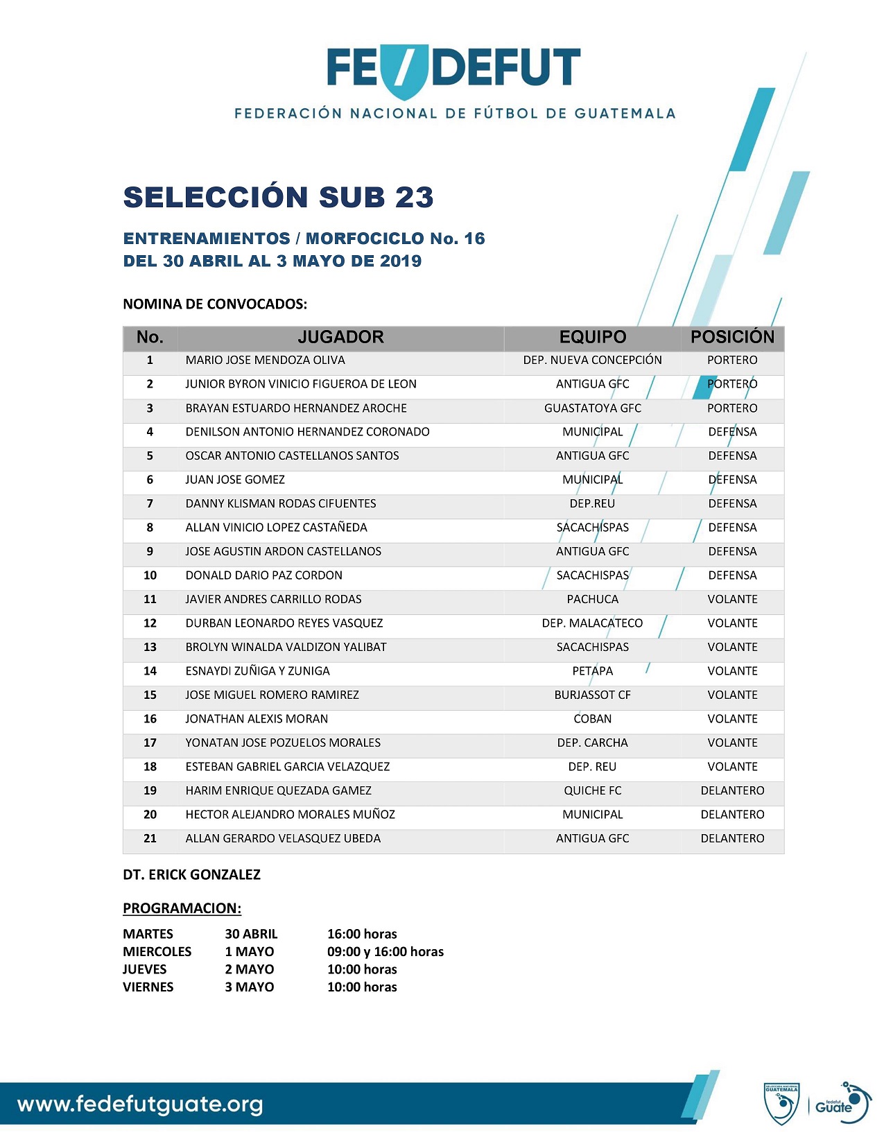 SELECCION SUB 23 / CONVOCATORIA MORFOCICLO NO.16 / DEL 30 ABRIL AL 3 DE MAYO 2019