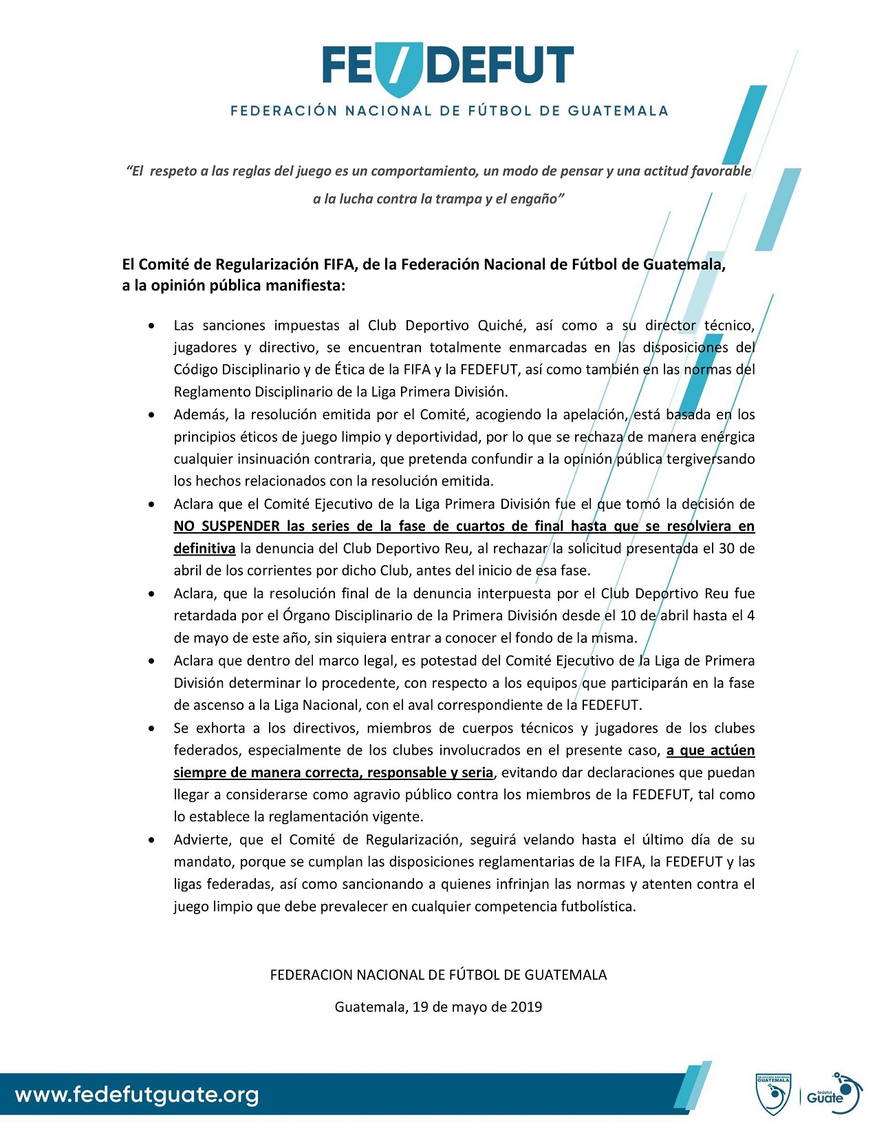 COMUNICADO OFICIAL FEDEFUT / SANCIONES IMPUESTAS AL CLUB QUICHÉ