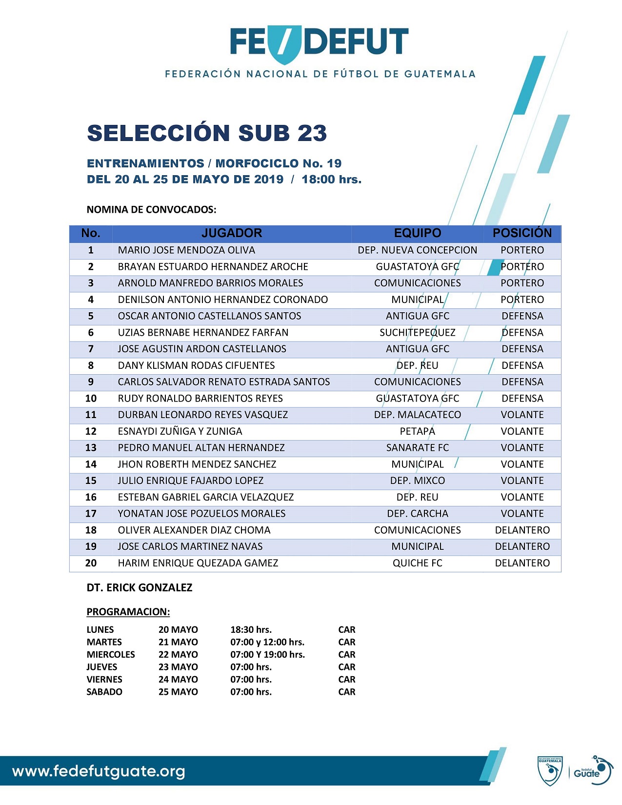 SELECCION SUB 23 / CONVOCATORIA MORFOCICLO NO.19 / DEL 20 AL 25 DE MAYO 2019