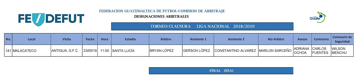 LIGA NACIONAL / NOMBRAMIENTO ARBITRAL MALACATECO vs. ANTIGUA GFC / FINAL IDA