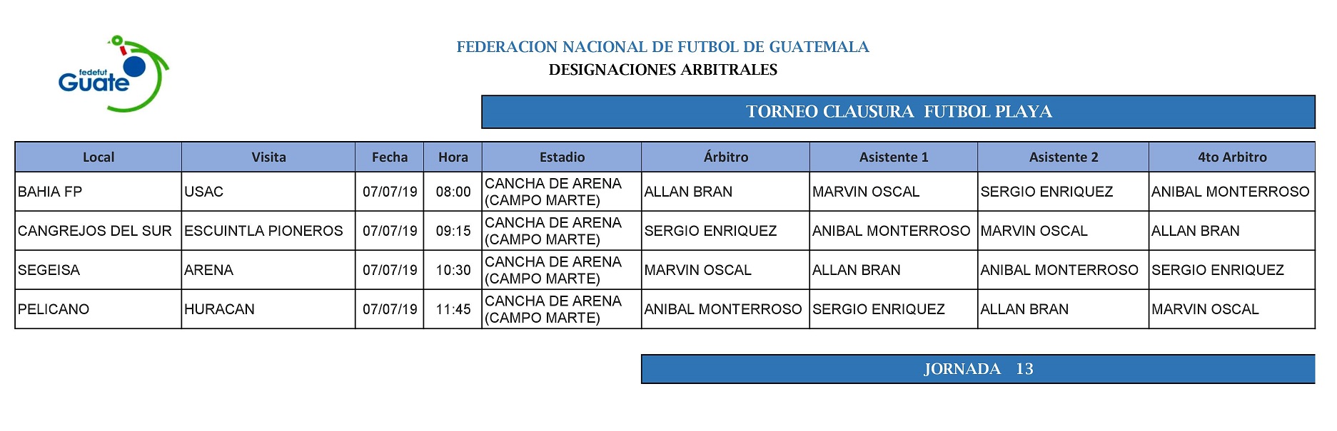 LIGA FÚTBOL PLAYA / NOMBRAMIENTOS ARBITRALES / JORNADA 13 TORNEO CLAUSURA