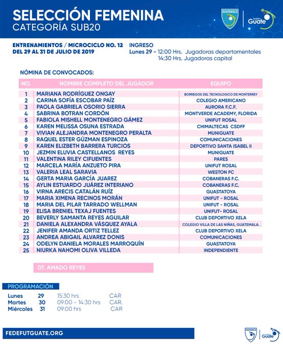 SUB 20 FEMENINA / CONVOCATORIA MICROCICLO No. 2 DEL 6 AL 8 DE ENERO 2020