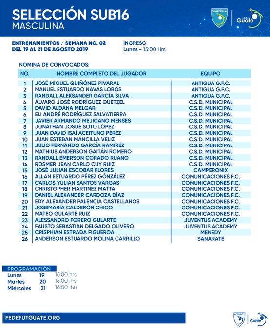 SELECCIÓN SUB16 SEMANA No.2 DEL 19 AL 21 DE AGOSTO DE 2019