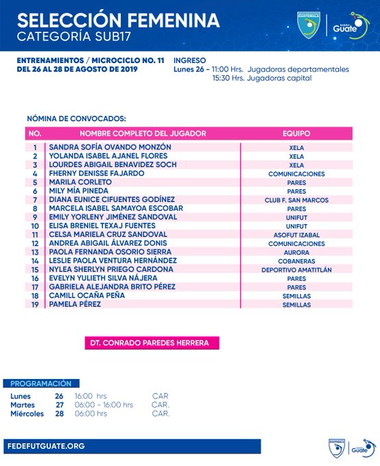 SUB 17 FEMENINA / CONVOCATORIA MICROCICLO No. 11 / 26 AL 28 DE AGOSTO DE 2019