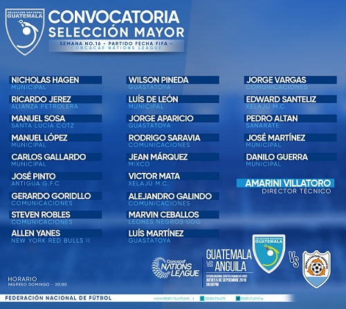 Guatemala, 28 de agosto de 2019. El director técnico de la Selección Nacional, Amarini Villatoro, confirmo la lista de 23 jugadores convocados para el debut de la bicolor en la Concacaf Nations League, ante la Selección de Anguila encuentro programado para el próximo 5 de septiembre en el Estado Doroteo Guamuch Flores a las 20:00 horas.