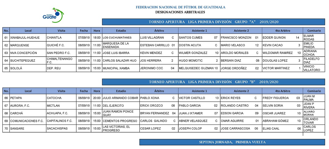 LIGA PRIMERA DIVISION / NOMBRAMIENTOS ARBITRALES SEPTIMA JORNADA TORNEO APERTURA