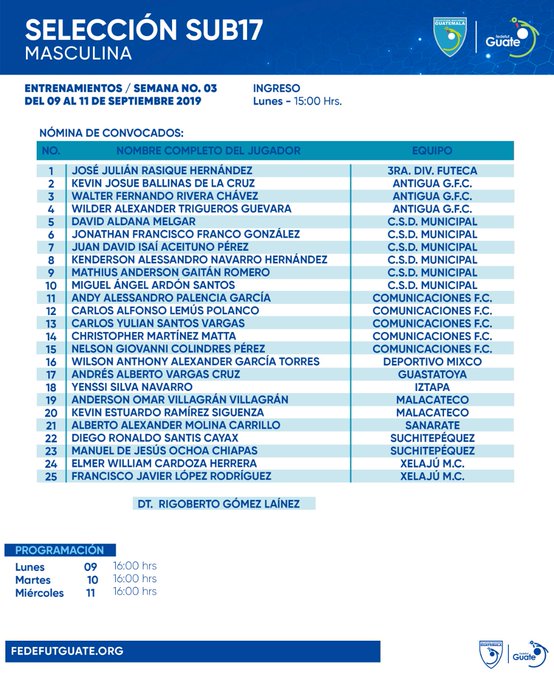SUB 17 MASCULINA / CONVOCATORIA MICROCICLO No. 3 / 9 AL 11 DE SEPTIEMBRE DE 2019