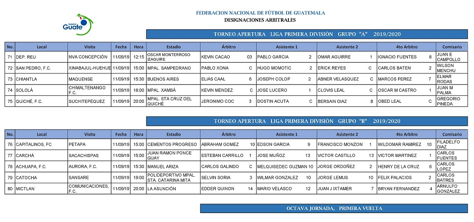 LIGA PRIMERA DIVISION / NOMBRAMIENTOS ARBITRALES OCTAVA JORNADA TORNEO APERTURA