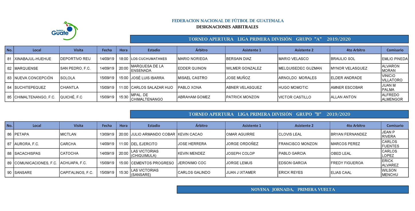 LIGA PRIMERA DIVISION / NOMBRAMIENTOS ARBITRALES NOVENA JORNADA TORNEO APERTURA