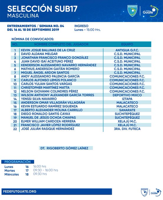 SUB 17 MASCULINA / CONVOCATORIA MICROCICLO No. 4 / 16 Y 18 DE SEPTIEMBRE DE 2019