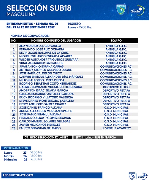 Guatemala, 20 de septiembre de 2019. Bajo la Dirección Técnica del Prof. Rigoberto Gómez Laínez y Prof. Rubén García DT Interino, la Selección Sub 18 masculina de Guatemala, (jugadores nacidos en el 2001) dará inicio la próxima semana a un nuevo proceso de preparación y entrenamientos con miras a competir en el Torneo Sub 18 UNCAF/FIFA Forward, evento de la región que forma parte de la competencia preparatoria de las selecciones centroamericanas de cara a las eliminatorias oficiales.