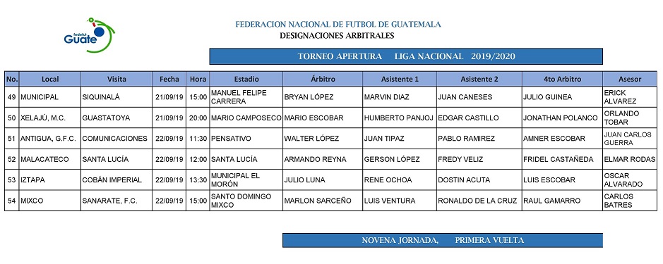 LIGA NACIONAL / NOMBRAMIENTOS ARBITRALES NOVENA JORNADA TORNEO APERTURA
